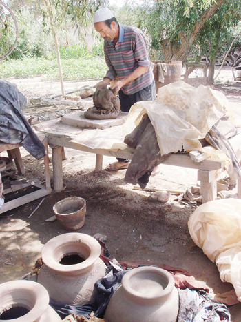 图木舒克陶匠乌布力·哈斯木正在用红泥河的泥制作陶瓮,今天的叶尔羌与塔里木河流域,居住在这里的维吾尔族群众依然习惯使用他们自己烧制的那种泥瓮,而且供不应求。
