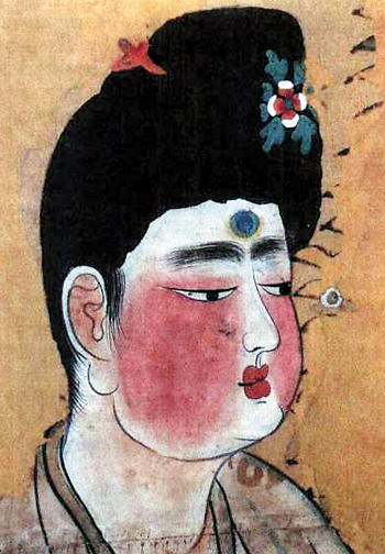 到了唐代,唇色更加丰富,唇形也千奇百态,但总的来说依然是以遵循娇小浓艳的樱桃小嘴为尚。另外,唐代还有一种花朵形唇式,正如岑参《醉戏窦子美人》中所称的“朱唇一点桃花殷”。值得一提的是,这一时期,往往还要在两个唇角外点出两个圆点(面靥)作为酒窝的强化,并认为这样可以增强女性的甜美与妩媚。