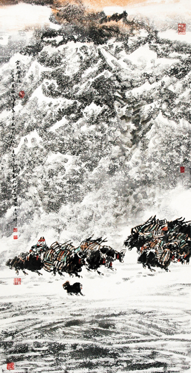 当然,五年对远古时代岩画的考察定然也会留下悠远的时间印记,高原系列中的人物、动物或与人类相关的房屋、帐篷、经幡等绘制得如同岩画般的原始简约。千年的风雨侵蚀之后,所有的细节都已被打磨干净,只剩下主干与象征了。尽管青藏高原是最年轻的地质隆升,但岩画却为我们留下了人类最为古老的影像。这种简约风格营造出一种考古遗址般的历史气息,时间在这种简约风格中表现出其最原始的沧桑感。牦牛是高原岩画中最重要的主题内容,这倒不是因为牦牛是青藏高原日常生活中最常见的动物,更重要的是牦牛象征着青藏高原的精神,也只有牦牛才能与青藏高原的巨大与厚重相匹配。尽管是简约的象征,驮着重物的牦牛蹒跚在山间草地,历史的隐喻顿时有了形象、有了色彩,有了生命。
