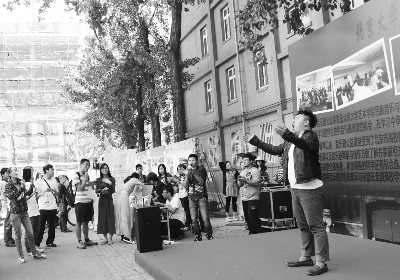 9月12日,北京大学校园一角格外热闹,正在纳新的“北京大学音乐剧公益课堂”,通过声情并茂的音乐剧演唱、优美动人的舞蹈表演等精彩节目,吸引着来来往往的学子驻足观看、询问了解并加入其中。