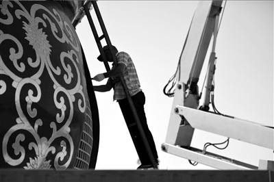 昨天,一名工人正在对准备安置于天安门广场的巨型花篮进行焊接。昨天凌晨,天安门广场花卉环境布置工作正式启动。据现场施工人员介绍,巨型花篮主体将在外场进行焊接、拼装、仿真花安插后再运进广场,目前已具雏形。整个摆花工程将于27日前完成。