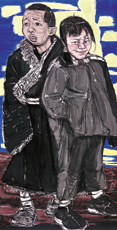 李连志用独特视角表现的藏族儿童可说独树一帜。《天堂·读书》《天堂·背影》《天堂·少女》充满了灵性的飞翔状态,饱含着浓郁的诗性气质。他为中国美术留下了藏族儿童艺术诗性的形象,那饱满的艺术想象力、对生命存在可能性的冲动式的艺术智性,都不可遏止地奔涌出来,画出了藏族儿童闪烁着轻逸的灵性之光。因此,李连志用笔墨游离于现实与梦想之间,从容地描绘现实和灵性的遐想之间。《天堂·行走》《天堂·收获》《天堂·神灵》《天堂·家人》《天堂·归去来兮》更是以浓重的笔墨塑造了质朴刚勇、忠厚愚直的藏族人民形象。敦厚的藏族人民从青藏高原徐徐飘逸而来,如天籁清响,他用笔墨赋予了藏民族血肉、生命和灵气。