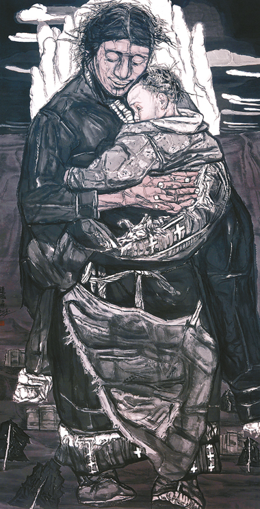 李连志在水墨画《天堂》系列中追求超越现实,追忆远古之中找到自身艺术发展的潜能,他解构生活,解构传统笔墨,解构青藏文化,去寻找建构属于自己心灵的时空关系。《天堂》系列在黑沉沉的墨色基调中,可以见出洒脱的运笔的凝重与沉着,笔痕、墨迹、意绪、情思,创造了属于李连志的视觉笔墨符号。《天堂》系列的心象话语与我们沟通,欲说不止,欲罢不能。所以,我们在《天堂》系列中,看到的那种充溢于笔触和墨层中的精神,是由笔墨直接表达出来的。其实,绘画的审美精神涵义往往不是通过理解的方式,而是在“品味”的过程中通过视知觉方式去把握的。其过程不免抽象,但它本身却能够相当确定地通过艺术的视觉形式输入、储存和输出某一时代或某一位画家的特定精神信息。这些信息的传达是靠其表层的主题内容,正如现代人在敦煌莫高窟或永乐宫所受的感染和震撼,并不一定依靠宗教的教义,而是来自壁画“美”的永恒魅力。简而言之,以社会性内容为艺术的精神,主题内容是实质的,形式美感是外在的;另外,以审美涵义为艺术精神,社会性内容是其表层含义,只有美才是深层次的,更本质的。若用真、善、美的原则来衡量,把艺术精神等同于社会实用功利目的,其实质属于“善”的范畴;应将艺术精神纳入“美”的范畴,美毕竟是艺术存在的本义,美可以与善结合,却不被善取代。我认为这是艺术本体论的深化,是从善向美的回归。李连志正是循着这个方向逐渐深化的,从《天堂》系列创作来看,他极力高扬的主题与墨象的图式都归于一种社会意念的驱动,他的艺术精神等同于这种社会性意念,而作品的审美形态则是围绕这种意念而展开的。
