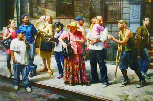 而最震撼我的,还是马克斯·金斯伯格的三幅油画:《公共汽车站》《皮耶塔战争》《无法赎回》,都是人物群像画,只是将特定场景放入一种复杂的社会大背景里,融入更多的现实苦难和个人的慈悲感,通过群体人物的姿势、动作和表情,表现画家的时代责任感和人文关怀。《公共汽车站》,有看书的姑娘,有抽烟的男人,有抱着小孩的老汉,也有以不同姿势站在那里等车的人,一位拄着拐杖的乞丐老汉,走过来伸手乞讨,一位戴着草帽的老妇人从包里掏钱(给乞丐),更多的人只是无关自己地望着……这是今天社会最普通的一种场景,但它充满着人性的关怀,充满了画家冷静的慈悲感。《皮耶塔战争》,一个女人双手抱扶着躺在地上的男人的头,仰天嚎啕大哭——那男人是她的丈夫,头上裹着渗血的纱巾,躺在地上,一只腿、一只手都已被炸掉……而他们的背后却是战争滚滚的硝烟——画家在呼唤和平,呼唤人道。还有好像是再现美国9·11事件现场目睹者表情的《无法赎回》,重现一种悲伤的记忆,唤醒人们对生命的珍惜,对大爱的追求及对惨无人道之恶行的谴责。