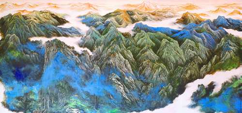 云横秦岭 1000cm×2000cm 为大明宫国家遗址公园创作巨幅金碧青绿山水画