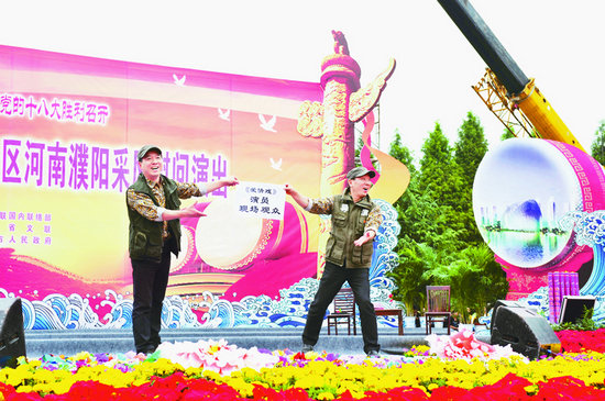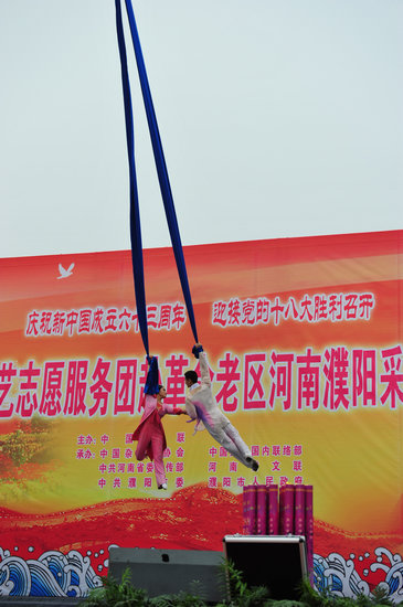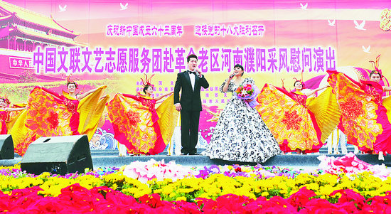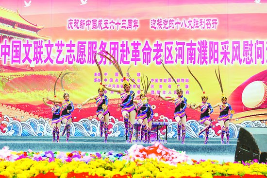 这里,为庆祝新中国成立63周年、喜迎党的十八大胜利召开,由中国文联主办,中国杂协、中国文联国内联络部、河南省委宣传部、河南省文联、濮阳市委市政府承办的中国文联文艺志愿服务团赴革命老区河南濮阳采风慰问演出活动正在进行。艺术家们的精彩演出和真挚祝福让当地群众在中秋、国庆两节前夕感受到了喜庆与温馨。歌声在这里飞扬,笑声在这里弥漫,掌声在这里飘荡,而“爱国、为民、崇德、尚艺”的文艺界核心价值观也在这里彰显和生动诠释……