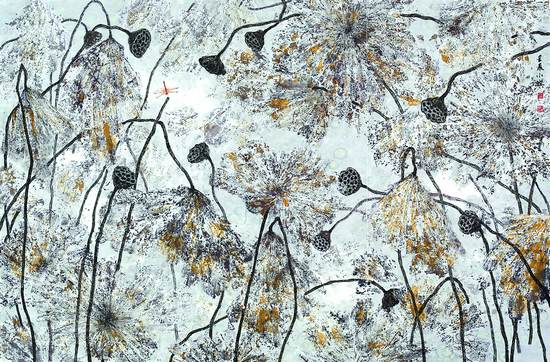 统观程小琪的荷花作品,不难看出两种言说方式:一是或用彩墨纵横挥洒、涂抹生成的一种心境,或以现代构成话语营造而成的一种情境;另一是用传统文人画语言在禅意中写就的一种意象。读他的画和与他交谈,都能感受到他徘徊于传统与现代中的矛盾。作品中那些以线条描写物象的执著,显现出其对传统笔墨深切的眷恋,但以现代构成为主体的语言图式,以及把画荷花当画山水的新思路与新实践,则消解了传统绘画状貌物象的单一功能,使它在事实上已不是传统话语的延续,而是现代知识分子情绪与心态的置换。