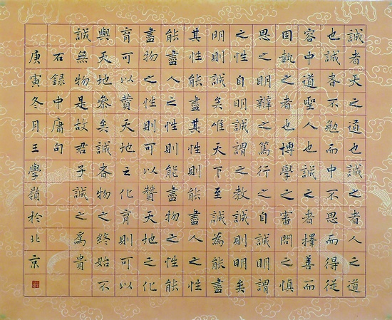 楷法之立,于当下,或可称之创新。揽进万籁参差,方可纳新。故曰,书艺之创新即变化。变化无形,神理自存;笔札盘旋,由貌现心。内里知识催生笔端变幻,少诵孔孟难立稳重,不读老庄难图散逸,未闻诗经难写天真,罢学乐府难有灵动,失阅礼记难出秩序;不观史则无骨,不问道则无筋,不训韵则无神;书迹如神,汉字若灵,一瞬僵滞也将掩没风采。胸藏丘壑,言启芳菲,才能于檀皮刻写三千大千。唯世界无穷尽,唯摹此无穷奇幻方能推陈出新。其要,在习日课,善发现、勤学习。如此可渐趋书之“文质”。