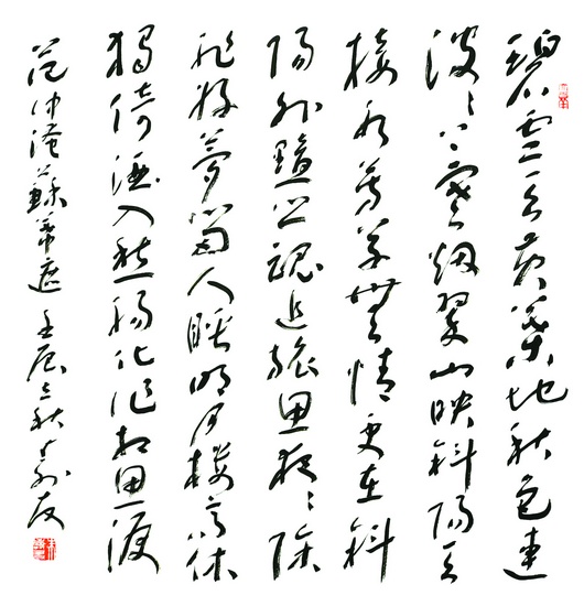 朱寿友的书法貌丰骨劲,超然独出。30年的军旅生活成就了他老辣、古朴、简洁的书法风格。年轻时他曾多次拜访林散之,交流中让他知道学习书法不能闭门造车,要陶冶于大自然,开阔胸襟,锻炼气质。此后又常于启功、沈延毅处聆听教诲,懂得了学习传统,临习古人是书法的必经之路。