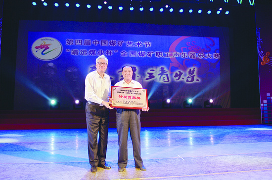 中国煤炭工业协会副会长、中国煤矿文联主席梁嘉琨为靖远煤业集团颁发特别贡献奖,靖远煤业集团党委书记程剑领奖