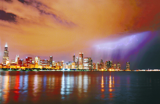 芝加哥之夜 芝加哥初夏的夜晚时常雷雨大作。绚丽的城市灯光与划破天际的闪电交相辉映,更衬托出这座迷人城市的变幻莫测。李庆梅(驻美国大使馆)摄于美国