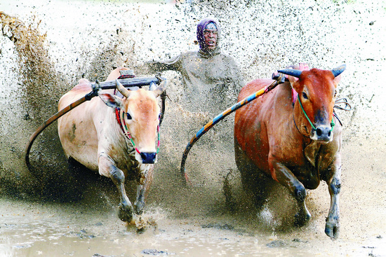 赛牛 每年丰收季节,在印度尼西亚西苏门答腊省巴东地区都要举办大规模的赛牛活动,场面十分壮观、惊险。钟瑞明(驻印度尼西亚大使馆)摄于印度尼西亚