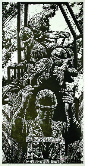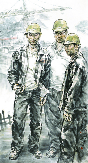南水北调渠首的工人们(版画)180cm×90cm 代大权