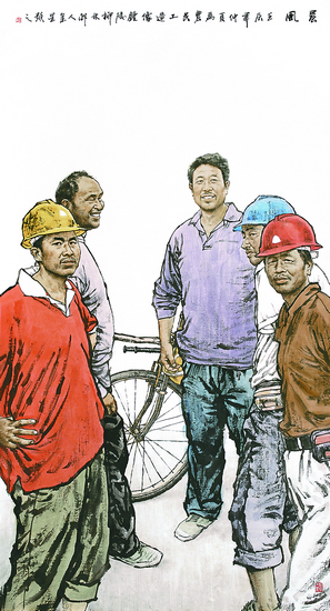红旗渠青年洞英姿(中国画)180cm×96cm 丁 杰