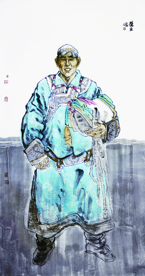 他画出了风雪中的人与马,笔墨间隐藏着默默挣扎的力量;他画出了草原上的妇女褐红色的衣衫与灰蓝的鸢尾花互相映照,有一种苍凉的妩媚;他画出了山岩深垂、大江平展的辽阔空间,在草原上,迂回的小路是牧民在不同的时间从不同的方向留下的足迹。引导后来者一步又一步地走向那坡顶高处的敖包。