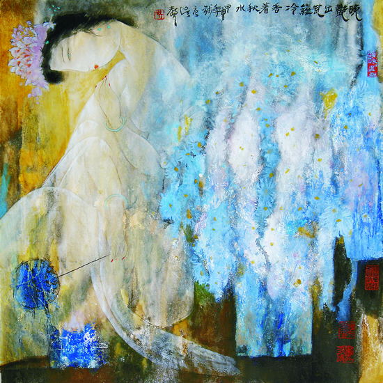 吴声谈到自己多年来的诗意画艺术创作,有着一段内心独白:“中国画的精髓和传统就是写意精神,而这种写意精神其实也是中国文化的精髓,在中国古典诗词中处处传达着这种精神。也许‘借题发挥’是对绘画形式本质的思考。近年来我更有兴趣的是文人画的即兴式、那种随机性的表现手法。我用抽象的符号、流动的墨趣以及斑驳、隐约的肌理手法来营造那种诗一般的古韵、天人合一、妙趣横生的境界。追求这一视觉语言自身的特性,努力摆脱世俗的羁绊,进入自娱自乐的精神境界。这是我希望进入的一种美好的艺术创作状态。”