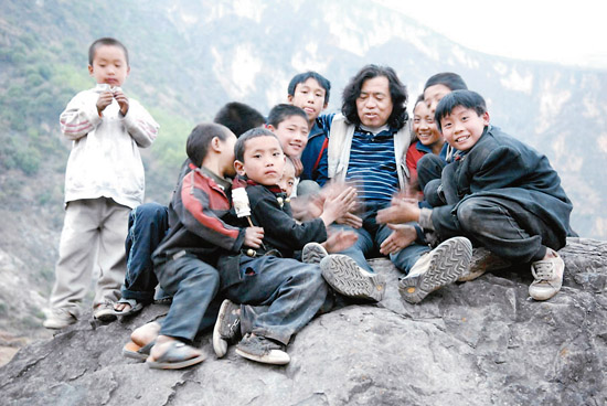 林强在麻风村采风的时候,因长途跋涉,累躺在石头上休息,孩子们以为他生病了,都围了过来。林强说我没有事,就是腿酸痛,走不动了。孩子们一听,一拥而上给他揉腿。助手用相机抓住了这一瞬间