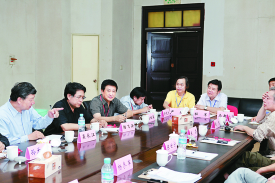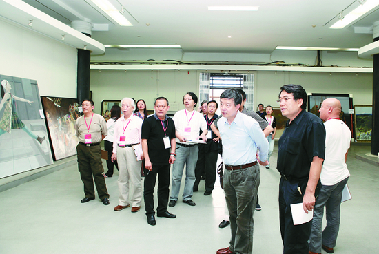 中国美协分党组书记、驻会副主席吴长江(左一)对画展评选工作进行小结