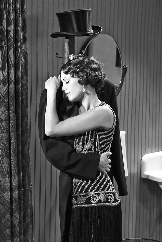 看似简洁叙事的背后,是创作者对时代特征以及人物形象的着力描摹,这使得影片虽然情节平淡,观众看来却丝毫不觉乏味冗长。剧中乔治与佩佩在楼梯碰面的片段是在洛杉矶的布拉德伯里大楼取的景。这座始建于1893年的建筑将观众带回那个遥远的年代,上下错落的结构更是与剧中人一个渐入事业谷底、另一个即将大展宏图的状态相契合。从乔治夫妇的餐桌对话到一段名为《佐罗的标记》的戏中戏,都不难发现导演向《公民凯恩》《一个明星的诞生》等电影史上佳作致敬的影子。片中饰演乔治的让·杜雅尔丹那一撮标志性的小胡子,以及他优雅不失幽默、真挚不失灵气的表演,更是让人们仿佛看到了卓别林、金·凯利那些默片巨星的风采。虽然有对经典的模仿,导演却摒弃了大部分默片的生硬与刻板,巧妙地取其精髓。片中乔治自导自演的《爱情的眼泪》里,他深陷泥沼、无声呐喊的场景巧妙地暗示着角色的身份与命运;佩佩在化妆间,忘情地将手穿进乔治的西装衣袖,并假扮成两人深情相拥的画面,更符合了“此时无声胜有声”的意境。