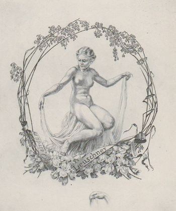 20世纪初后洛可可藏书票。马斯塔纳的书票多以雕塑人体(女性)为核心附以S漩涡型花带、绸带作点缀,画家华丽逼真的画风甚至超越了他的前辈颓废主义的代表人物拜劳斯。 藏书票收藏家子安提供。