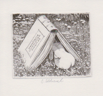 说到书票上的那行拉丁文,这涉及“国际藏书票联合会”(简称:FISAE)对藏书票创作的一些规范要求:每枚藏书票上必须标示各国公认的藏书票标记,即拉丁文“EX—LIBRIS”字样,同时也允许印有收藏者的文字说明,如“书票”、“藏书票”、“某某藏书”、“某某的书”等中文字样,票面还必须有票主即此书拥有人或藏书者的姓名,或别名、书斋名、书号、藏书年份等。藏书票要求是版画原作,幅面尺寸一般在12至17平方厘米以内,下方边缘一般应有书票创作者的铅笔签名。此外,在参加国际性的展览和交流中,创作者有义务在完成制作后,用铅笔按顺序从左至右写下版式代号、印数、作者签名和创作年代。——懂得这些基本常识,可以帮助我们比较正确和专业地去欣赏一枚完整的藏书票所包含的艺术元素。正如去参加正式的音乐会,在走进音乐厅之前,必须应该懂得一些基本的音乐礼仪一样。