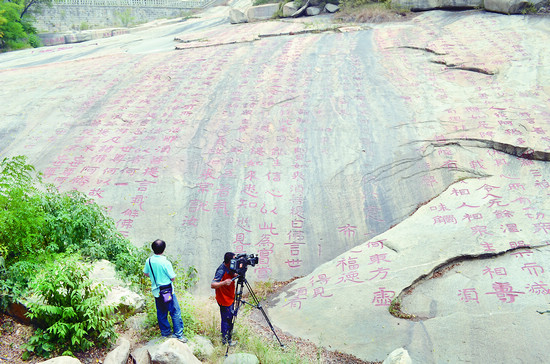 在央视中文国际频道2013年的开年大片《中国书法五千年》的拍摄过程中,5个摄制组走过近10万公里、横跨欧美亚三大洲,拍摄考古遗迹和博物馆数百处、有关书法的文物3万余件,力图呈现书法的核心价值。图为摄制组拍摄摩崖石刻。