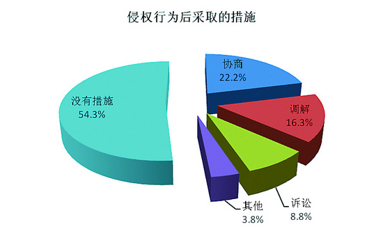 从调研反馈的结果来看,各门类的文艺家和文艺工作者中权益曾遭受侵害的平均比例在50%以上,个别门类高达70%。人身权和财产权都存在受侵害的情况。财产权中最容易受到侵害的是“复制权”,占50%以上,其次为“信息网络传播权”,反映了当下由于出版业和互联网领域技术的飞速进步,导致文艺作品被盗版侵权的情况十分严重。而当侵权行为发生后,文艺家和文艺工作者依法维护自己合法权益的意愿与能力明显不足。大部分(54.3%)文艺家和文艺工作者权益受到侵害时选择不采取任何措施,处于非常被动的地位。在主动采取措施的文艺家和文艺工作者中,占比例最多的是采取协商和调解的方式,诉讼占的比例较小。可见多数文艺家和文艺工作者的维权意识比较淡薄,主动维权的积极性不高。其中主要原因一是由于文艺家和文艺工作者的法律意识不强、个体维权能力不高,对《著作权法》等相关法律知之甚少;二是担心法律维权的人际关系成本、时间成本和金钱成本过高等。
