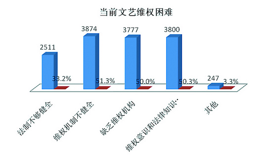 对于目前文艺界维权面临的主要困难,各不同艺术门类的文艺家和文艺工作者的选择基本一致。对“法律不够健全”、“维权机制不健全”、“缺乏维权机构”、“维权意识和法律知识欠缺”的四个选项选择的人数比例不相上下。这一点充分说明,当前文艺界维权的总体形势是不容乐观的,在健全维权机构、加强维权机制建设、提高维权意识、普及法律知识、推动法律完善等各个方面都需要做大量的艰苦工作。