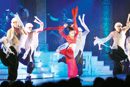 舞台上,熊熊燃烧的火焰、肃穆的石门和暗红色灯光中高耸的神秘湿婆神像一一展现,带有浓厚异域风情的音乐响起,观众们的注意力立刻被眼前的一切紧紧抓住。古老的拉贾斯坦邦,神像俯视着芸芸众生。舞者们身着长裙,欢快地飞速扭动腰胯,带来了最纯正的印度传统舞蹈——卡塔克舞。姑娘们随着鼓点舞起脚上的铃铛,清脆的铃声从轻柔的慢板渐渐过渡到暴风骤雨般密集。她们艳丽的裙摆和长长的头纱旋转打开,如同一朵朵盛放的花。敲击长鼓的小伙子此时也跟着转动起来,帽子上的红缨划出一道道美丽的弧线。迅疾的鼓点中,台下的观众几乎分辨不清节奏,却仍用掌声紧紧跟随着他们的跳动……《宝莱坞明星》凭借着最纯正的“印度风”,感染着现场的每一个人。