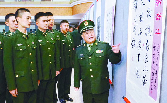 军事博物馆书画院常务副院长、军旅书法家李洪海从阅读《雷锋日记》过程中获得启发,从中节选出50条最精彩、最闪光的语录片段,用书法的形式、书法的语言、书法的意境,精心创作了50幅书法作品,并由长城出版社集结出版。图为李洪海在赠书仪式后向官兵们介绍自己创作的作品。