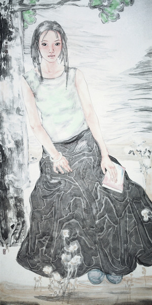 两大派别或称为体系的绘画最直观的区别在笔墨,体现在王淼田风格迥异的两大类作品中,则是“文人笔墨”与“非文人笔墨”之异同。他的“都市丽人”系列是以现实为依据,以人物为中心。西画的构图与造型方法帮助了他,使他在表现都市少女的手法上游刃有余,别开生面。但就笔墨表现而言,从写实中脱颖而出的表现性的线、墨元素,特别是对线的运用,已不是传统意义上线的用笔、组织与疏密关系,更多的是作为人物形体外轮廓的强调,而墨的运用则是在为造型服务的基础上,根据描绘对象的丰富和感悟的新颖,相应地发展前人所无的笔墨。结构处严以定位,非结构处适当放松,有实写、有虚写、有夸张、有省略,力求以写实为基础参酌写意,在新世界的探索中实现笔墨与造型的兼容,增强了画面整体的表现力和感染力。他不是得自文人画的笔墨工夫,而是得自悟性和对东西方绘画的广泛学养。