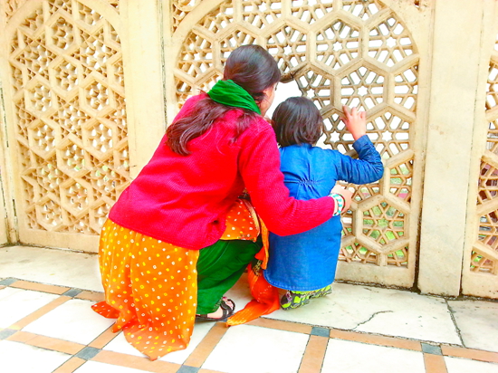 阿格拉红堡 这是莫卧儿国王萨·贾罕被皇子囚禁之地,据说萨·贾罕总是站在城楼的一边远眺着他亲自设计并下令建造的泰姬陵落泪。图为站在城楼的缺口处的印度妈妈对女儿讲述萨·贾罕眺望泰姬陵的故事。