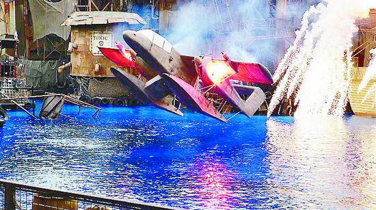无独有偶,在另一座小水池里,演绎着几位勇士在“大西洋”上与海盗们周旋、搏战,他们驾驶着摩托艇,在码头和加勒比海盗船之间的“惊涛骇浪”中飞速穿梭,忽而持枪射击对方,忽而从高处跌入水中,忽而冒死救援战友,紧张激烈,险象环生,又不乏幽默风趣,最终战胜海盗,精彩表演激起观众欢呼雀跃。