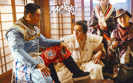 《厨子戏子痞子》定档于“愚人节”,以戏谑荒诞的叙事风格掀开了三个男人的疯狂整蛊戏中戏。影片以抗日战争为叙事背景,却并未浓墨于敌人的大肆入侵或战争对百姓的迫害,而是通过发生在日本料理店里的一场荒诞、诙谐的闹剧,以戏说的方式展开叙述,从而巧妙地规避了战争题材影片的刻板和循规蹈矩。影片开篇即上演了一段痞子拦路抢劫的戏码,痞子误打误撞将两个日本人劫到一家日本料理店,遇上了性格胆小的厨子和神神叨叨的戏子,一连串戏剧化的故事由此展开。这样的开篇极易使观众以为这三个小人物阴差阳错地与两名日本生化专家纠缠不清,并沉浸在这群“混搭”人物之间的各种搞笑怪事之中,实则不然。影片随即以倒叙的形式揭示了三位主角的真实身份,并交代了此次劫持并非偶然,而是经过精密设计,目的是为了截获日本人救治“虎烈拉”瘟疫的疫苗配方,完成救国重任。此番剧情设置着实令观众大感意外,看似荒诞幽默的小故事背后却藏匿着抗日救国的大计谋。随后展开的叙事环环相扣,三位主角在嬉笑怒骂中惊险地获取情报,紧张而搞笑。然而,相较于前半部分流畅完整的叙事,影片后半部分的起承转合则看似凌乱无章,不免给人以随意拼凑之感,且闪回的运用略显刻意,合理性不够。