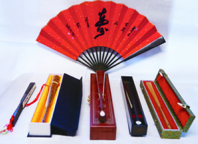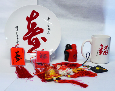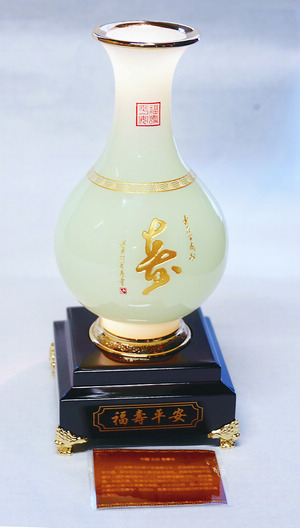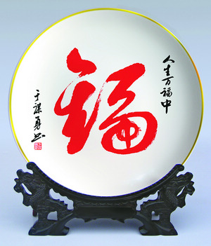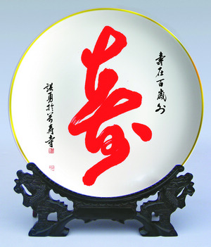 于谋勇福寿字一笔书被开发成艺术产品,从上至下分别为:“福”字瓷盘、“寿”字瓷盘、福寿瓶艺术品、福寿挂件艺术品、福寿扇面艺术品