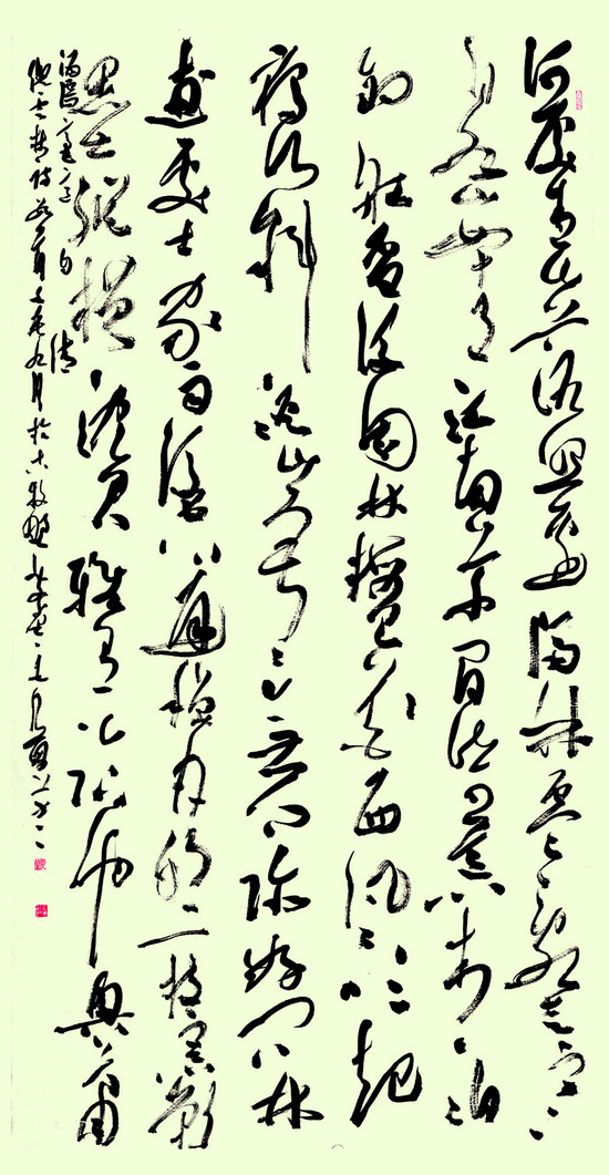 3月,白煦的《水墨书法评论集》首发,书中展示了他创作的“水墨书法”中的40余幅作品。这批带有实验性质水墨书法作品的探索获得了成功,为当代书法的创作提供了一种新的视觉面貌和审美范式。4月底,艺术家邵岩个展在北京今日美术馆举办。在此次新作展上,邵岩创作了极具视觉震撼力的巨型“射墨”作品。在现场,人们需要登上由脚手架搭起的回廊,借着架设在12.5米的展厅顶部的探照灯才能来回“扫视”眼前的巨大书法作品。书法家普遍认为“墨象书法”的提法,是一个崭新的课题。2012年伦敦奥运会期间,在“创意城市2012伦敦美术大展”中,展出了书法家言恭达的书法作品——15米的《体育颂》长卷。言恭达以最能表达书法艺术的大草书体和最具古典特色的长卷形式来进行创作。作品中结体章法自然简约,线条厚重坚定。整幅作品雄逸遒劲,正所谓“惟观神采,不见字形”。