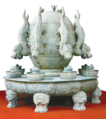 “青铜地动仪”。青岛市著名诗人、知名收藏家纪宇收藏。尽管已被专家高度认同其历史价值和文物价值,但社会上还是一片打假声。
