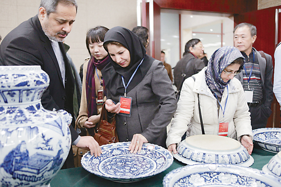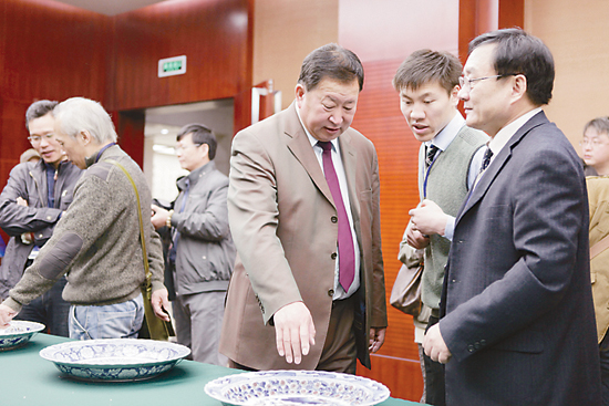 在国际元青花学术会议上,伊朗国家博物馆专家(上图)、蒙古国家博物馆馆长(下图)观摩元青花展品。