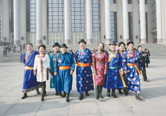 2011年,出席第九次全国文代会的内蒙古文艺界代表走出人民大会堂