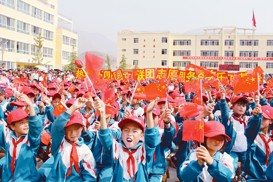 马街小学的学生挥舞着小红旗为艺术家们的精彩表演喝彩 本报记者 董大汗 摄