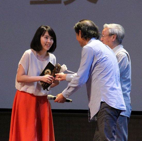 谢飞、陈国星为金奖获得者《父亲》的作者梁文哲颁奖(李博摄)
