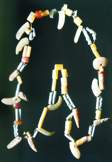 玉串饰(长约40厘米) 陕西省长安县张家坡西周墓地出土 由椭圆形玉饰、三棱形玉饰、玉蚕、玛瑙珠、管等组成