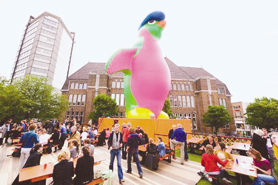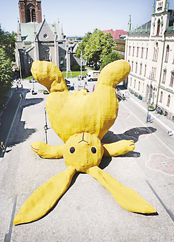 10米高的Kobe Frog大青蛙,趴在安藤忠雄设计的神户兵库县立现代美术馆上方;11米高的“钢铁侠”大棕熊,拎着大白枕头在阿姆斯特丹的街市中“游走”;16米高、颇有艳俗艺术之风的企鹅Michael Moore,在荷兰亨厄洛和乌特勒支的街头“犯傻”;同样高度的黄兔兔Stor Gul Kanin在厄勒布鲁“摔倒”,更具有骇人的架势;两件18米高、用铁丝、足球网和4万块彩色塑料布组成的Slow Slugs大蜗牛,漫步在通往法国昂热的大教堂的古道上,更为城市增添了几分迷幻的童话色彩。Florentijn Hofman的作品将日常可见的事物放大,在人来人往的广场上、在水面上、荒地上……对他而言,艺术不在博物馆,而在人群间。