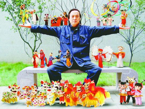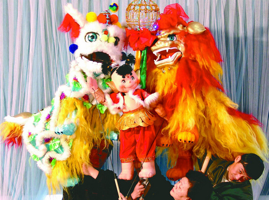 曹继宗设计制作的具有浓郁中国元素的杖头木偶形象小金娃和狮子