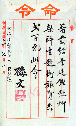 孙文饬发李廷铿、梁醉生旅费手令