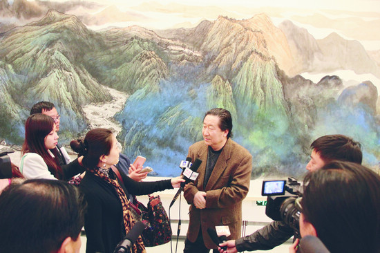 中国国家画院院长杨晓阳在画展现场接受媒体采访