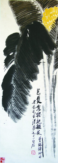 画芭蕉卷叶时老人迟迟不敢落笔,忽然问胡絜青先生:“芭蕉卷叶是左旋还是右旋?”胡絜青在四川住过多年,院中有芭蕉多棵,可是没注意过呀,答不上来,老人只好放弃画初生的卷叶。老人的认真负责可见一斑,虽是大写意,但绝不马虎,更不乱来,处处是以生活实情为准的。可见,老人的画都来源于大自然,是经过多次仔细观察和提炼的。