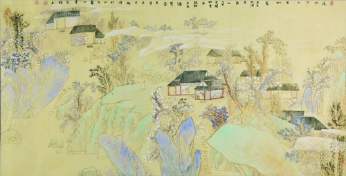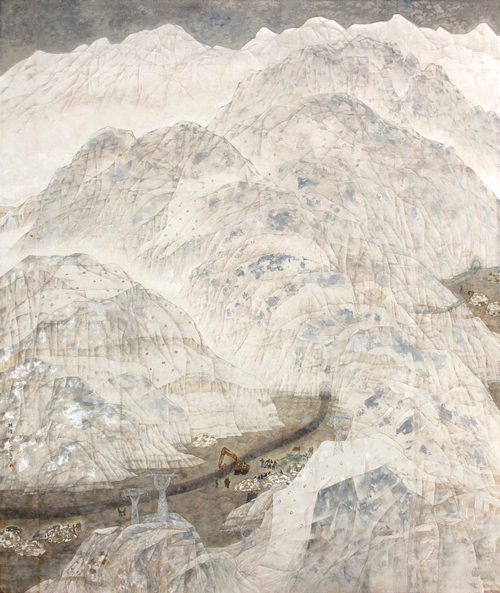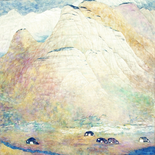 一个画派的诞生,往往依赖于一种艺术风格的形成。岩彩作为中国最古老的美术色彩表现形式,出现在原始的半坡彩陶及马王堆帛画和漆画之中。及至唐代,工笔重彩则成为鼎盛一时的时代美术标志。元代以后兴起的“文人画”、“水墨画”,将工笔重彩冲击成为民族的边缘画种。在当代艺术多元化的势态之下,工笔重彩又焕发出了令人欣喜的艺术魅力。孙恺近年来的中国画山水创作,在原先的重彩基础之上,通过自己孜孜不倦的探索,逐步形成了一种有别于他人的没骨岩彩画法。学术意义上的岩彩画色彩体系是由纯天然矿物色、新岩矿物色、水干色、云母色和闪光色五大类组成,并结合金属箔来完成作品,岩彩画是一个自由宽泛的概念,没有过多的程式化与既定的要求。进入二十一世纪后,岩彩画已经被美术界诸多画家广泛运用到许多大型创作之中。难能可贵的是,孙恺在继承传统的基础上发展并推进了岩彩画的艺术表现形式,通过自己多年持之以恒、坚韧不怠的反复探索,逐渐形成了属于自己的特立独行、与众不同的表达方法。她的作品融汇中西,她的人物和花鸟,既有传统的勾线填色,又融入了西方绘画的色彩构成。在她创作的数量可观的山水画作品中,由不同颜色的颗粒反复叠加产生的那种强烈视觉效果,既具有一种意象朦胧的感觉,适合东方人的审美习惯,又突出了山石树木层层叠叠相加而产生的那种自然肌理特征,真正达到了和谐统一的艺术效果。