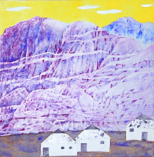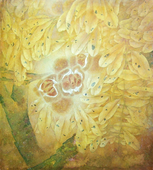为提高画面由对比而产生的强烈感染力,孙恺探索了不同矿物材料带来的刚与柔的对比效果。如颜色与箔放在一起,颜色会显得柔软,箔就会显得刚硬。又如蛤粉与矿石的颗粒用于同一画面,蛤粉显得柔软细腻,粗颗粒的矿物色就显得硬朗干涩。为丰富矿物颜料的多样性,她在写生过程中总是留意搜集各种不同的彩色矿石。每次发现她都会如获至宝,将它们从遥远的山区历经长途劳顿背回画室,然后亲自研磨、研制成纯天然矿物颜料。孙恺还认真研究岩彩与水墨的结合。中国水墨画是以水调色,而颗粒状的矿物颜料则是以胶为载体用于画面的。如何解决水色、墨与岩彩在绘画过程中能运用自如,孙恺着实探讨并下了一番苦功。她在一遍又一遍地艰难探索过程中,终于逐渐确立了属于自己的一种绘画施色方法,即用岩彩的深浅变化替代了传统国画墨、色的水性变化。以水墨笔法用于岩彩的施色造型,以用笔的方圆正侧、转折顿挫,塑造岩彩画作中变化多端的物体形象。在随后多次的绘画实践中,她精心创作的各种题材的岩彩画作品,普遍得到了美术界专家学者们的高度赞扬与肯定。