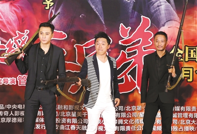 “三兄弟”刘烨、黄渤、张涵予带着家伙上阵,为新剧造势。新京报记者 郭延冰 摄